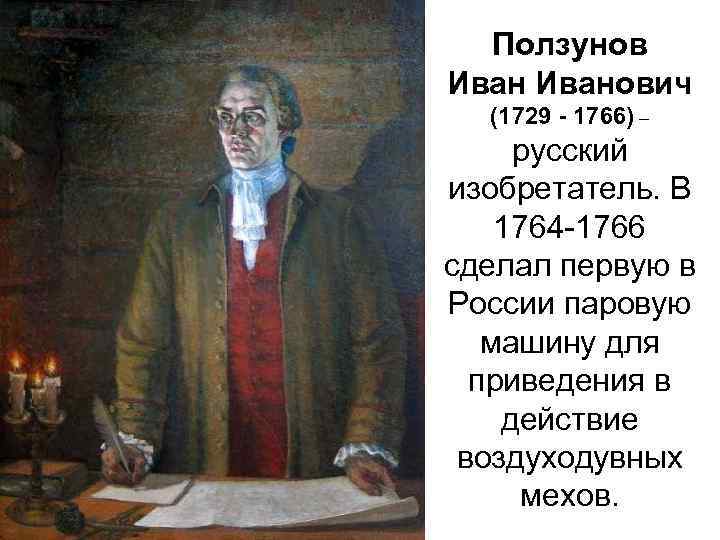 Свой вклад в развитие автомобилей внёс русский механик И. Ползунов, который в 1765-ом году сумел построить первую в мире паровую машину.